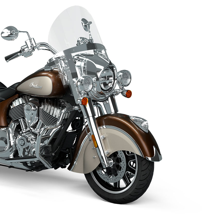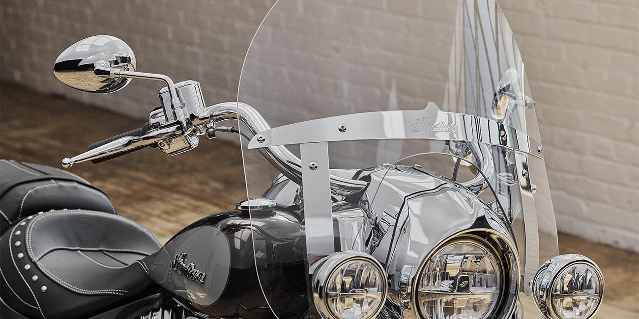 クイックリリースウィンドシールド、本革シート、リモートロック式ハードサドルバッグ、ハイウェイバー、ライトバー、ライディングモード選択可能、ABS、クルーズコントロール、キーレスイグニッション、Indian®スクリプトタンクバッジ、12V充電ポート